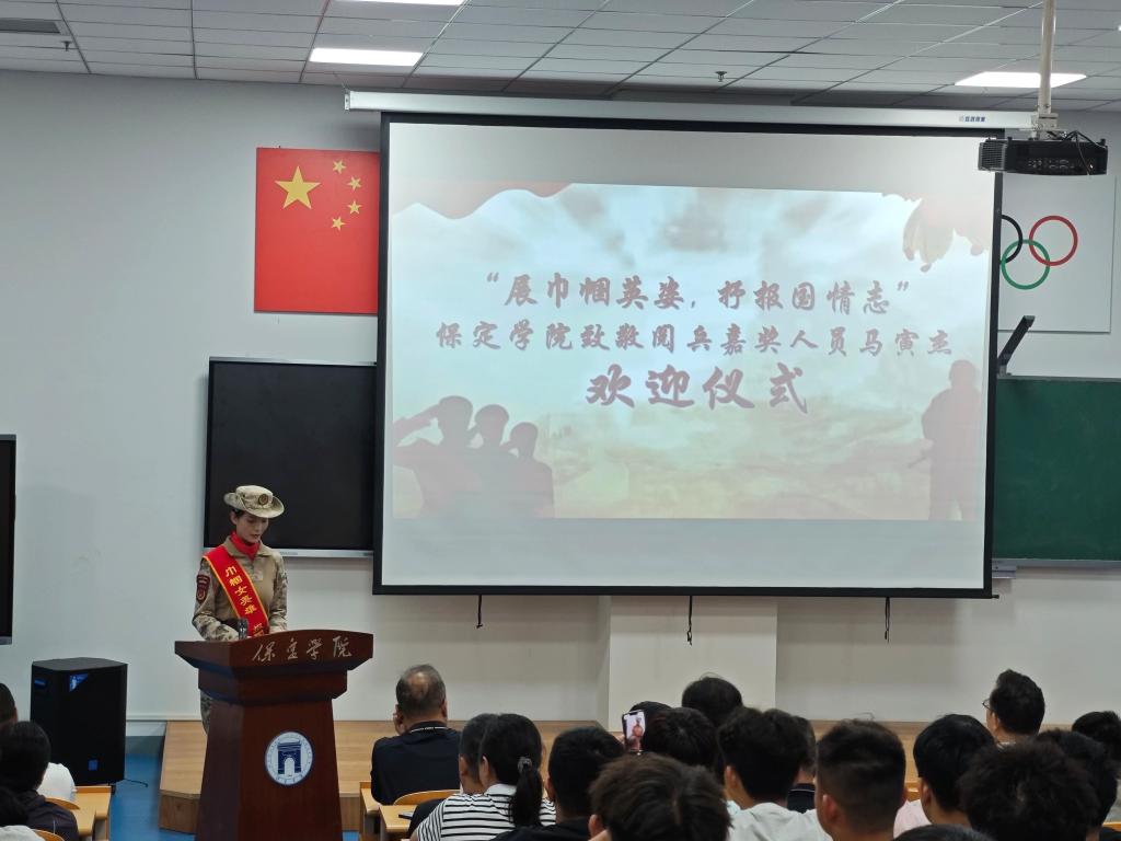 仪式上,校党委常委、副校长赵晓明为马寅杰颁发“体育学院荣誉证书”。4名退役大学生士兵代表师生向马寅杰献上代表敬意的鲜花。保定学院优秀校友、著名漫画家陈永亮向马寅杰赠送肖像漫画作品。马寅杰在发言中讲述了参训体会、受阅的自豪感,表达了将个人成长融入国家需要的坚定选择和青春使命感。